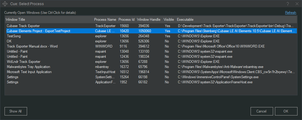 Het venster hieronder zal openen. Selecteer de regel die in de kolom ‘Process Name’ de naam ‘Cubase’ bevat (in dit voorbeeld ‘ExportTestProject’) en klik ‘OK’. Note dat de hier geselecteerde instellingen worden opgeslagen en de volgende keer dat je ‘Track Exporter’ gebruikt niet opnieuw ingesteld hoeven te worden.