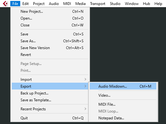 De toetsencombinatie die het Audio Mixdown venster opent is zichtbaar in het hoofdmenu. Ga naar ‘File > Export’. De toetsencombinatie is rechts naast de tekst ‘Audio Mixdown…’ weergegeven, in dit geval ‘Ctrl M’.