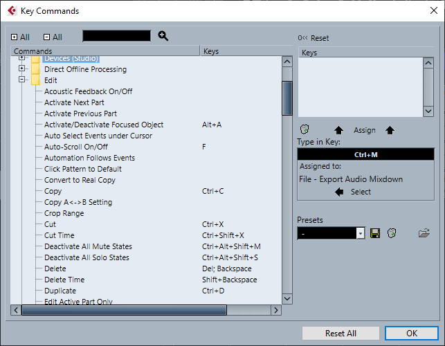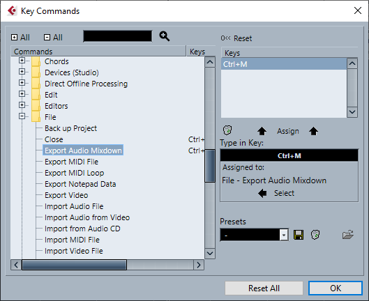 Voor het exporteren van tracks in Cubase zijn een aantal toetsencombinaties van belang: