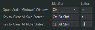 De toetsencombinaties voor het resetten van solo en mute statussen komt sterk overeen met wat hierboven beschreven is voor het openen van met Audio Mixdown venster. Om te bepalen wat op dit moment ingesteld is ga je in het hoofdmenu naar ‘Edit > Key Commands…’.