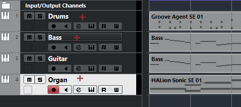 Het plaatje hieronder laat zien hoe e.e.a. er uit ziet wanneer de Drum, Bass en Orgel track geëxporteerd gaan worden